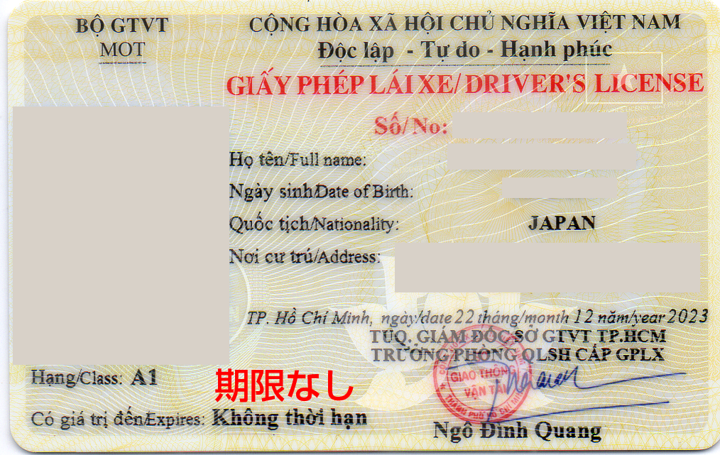 ①は期限無しなのでとてもいいのですが、ベトナム語の法規試験は日本人にとっては少々ハードルが高いので、ほとんどの場合は①でA1免許を取得します。しかし、①の場合は期限があり、それはレジデンスカードなどの滞在許可証の期限と同じになります。ただ、日本の運転免許証の書換えではありませんので、今後の更新には日本の免許証が必要でなく、これは大きなメリットです。