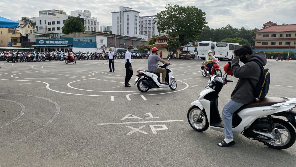 日本の普通自動車免許があれば、その免許をベトナムの普通自動車免許B1に書き換えることで、ベトナムのバイク免許A1が実技試験のみ(法規試験免除)で取得できます。これまでは、オートマチックバイクの経験はあってもロータリーギアバイクの経験のない人にとっては、このバイク免許A1の実技試験はちょっと難しかったのですが、かなり簡単になりました。2024年5月現在、A1免許を取得後に1度更新すると無期限免許が発行されていますので、ベトナムの街を自由に動き回りたい方はぜひベトナムバイク免許A1の受験をお勧めします。