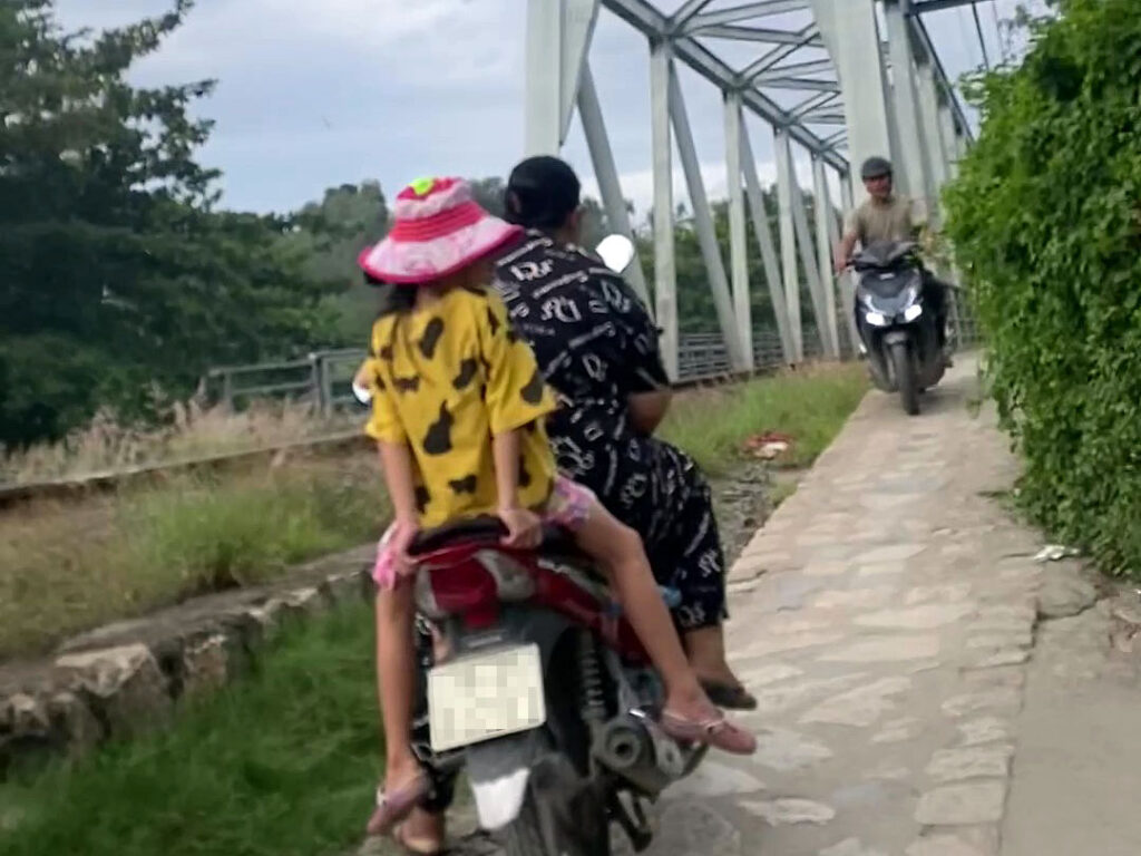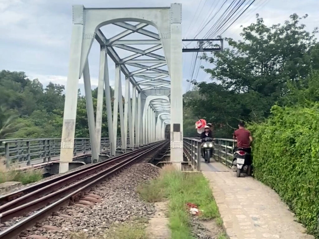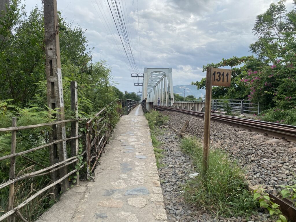 地図を見ると分かりますが、Cai 川を渡る鉄道の脇に併設されている長さ約150mの橋です。この橋、鉄道のおまけみたいな感じで作られていて物凄く細く、バイクや自転車が1台分しか通れません。バイクだけでもあまりにも細いので走るときはちょっと緊張してしまいます。もし前からバイクが来るのに気が付かずにこの橋を渡ってしまうと、大変なことになってしまうでしょう。渡るときはちゃんと前方に逆向きに向かってくるバイクがないことを確認しないといけません。