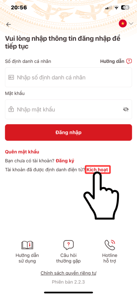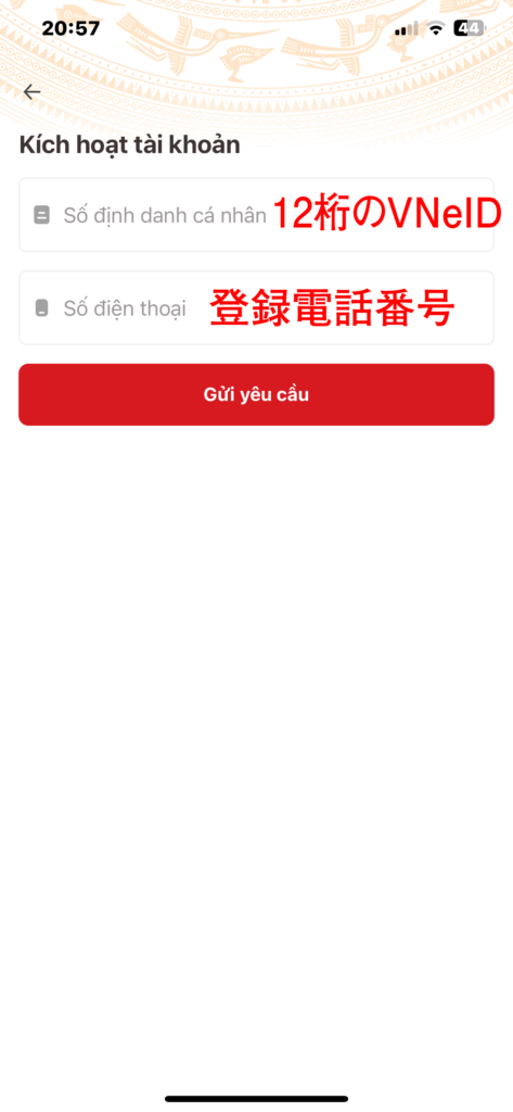 コピーをしたら次はVNeIDアプリを開きます。開くとIDとパスの入力画面が出てきますが、まだアクティベートしていませんので「Kích hoạt」をタップします。するとIDと電話番号の入力画面が現れますので、送られてきたIDと登録電話番号を入力します。
