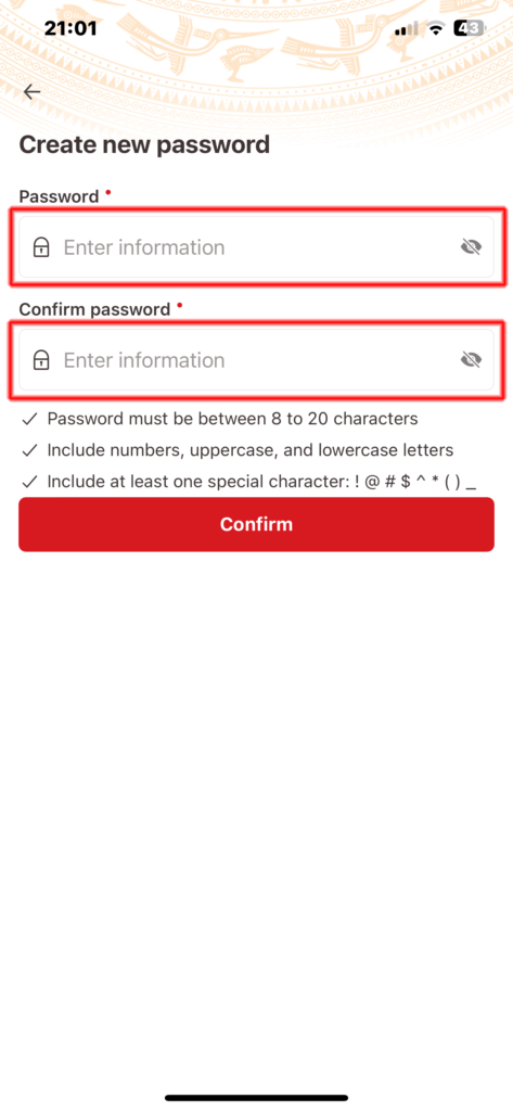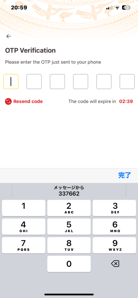 IDと登録電話番号を入力して「Comfirm」をタップするとショートメッセージで6桁の数字が送られてきますので、これを3分以内に次の画面で入力します。3分が過ぎるとこの6桁の数字が有効でなくなるので「Rsend code」をタップして再送を要求します。