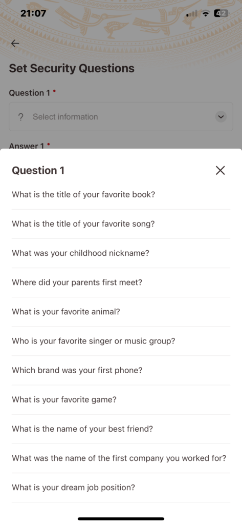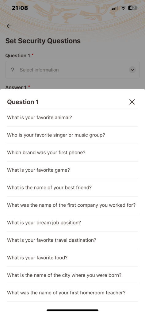 パスコードの次は秘密の合言葉の設定です。これは2つ設定します。15例の選択がありますのでこの中から二つ選んで設定します。