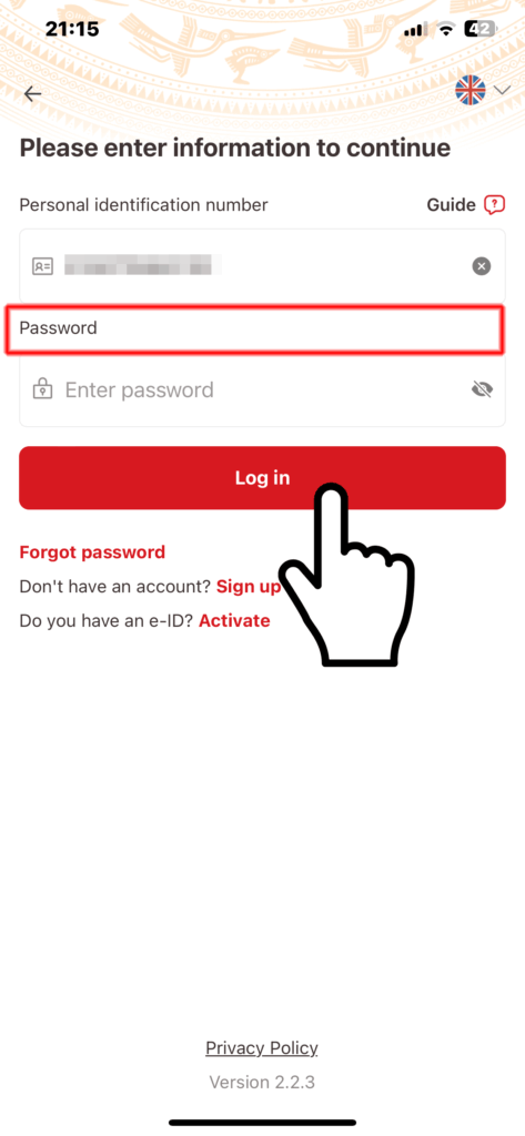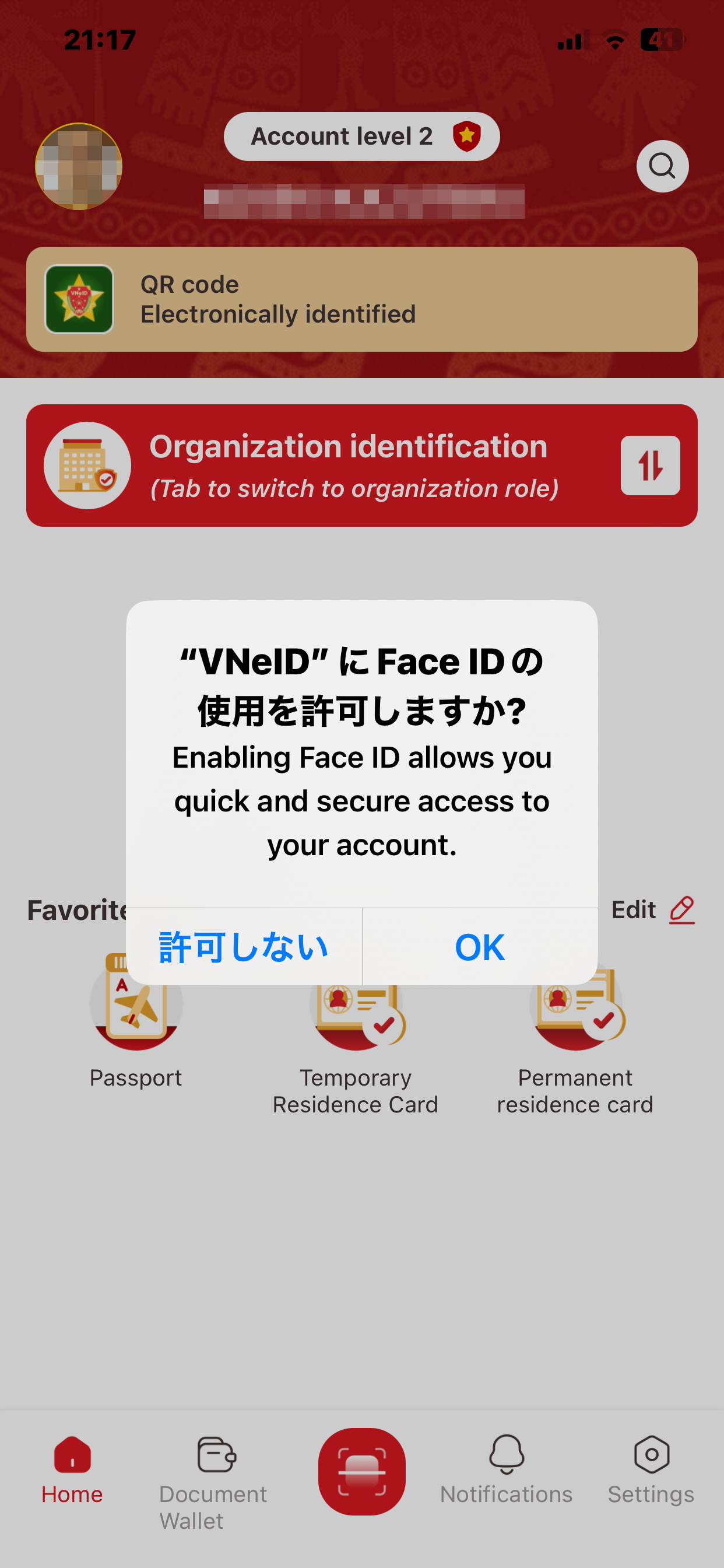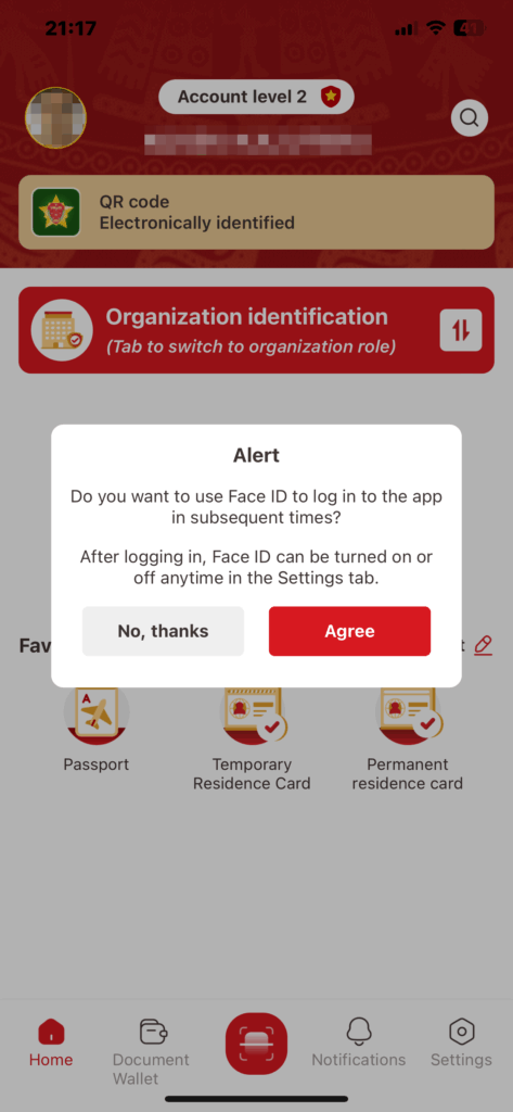 次はログインしてみます。アクティベートが完了するとログイン画面が表示されますので、ここで先ほど設定したパスワードを入力してログインします。初回ログインでは顔認証を使用するかを聞かれます。AgreeをタップするとiphoneからVNeIDに顔認証の使用を許可するか聞かれます。